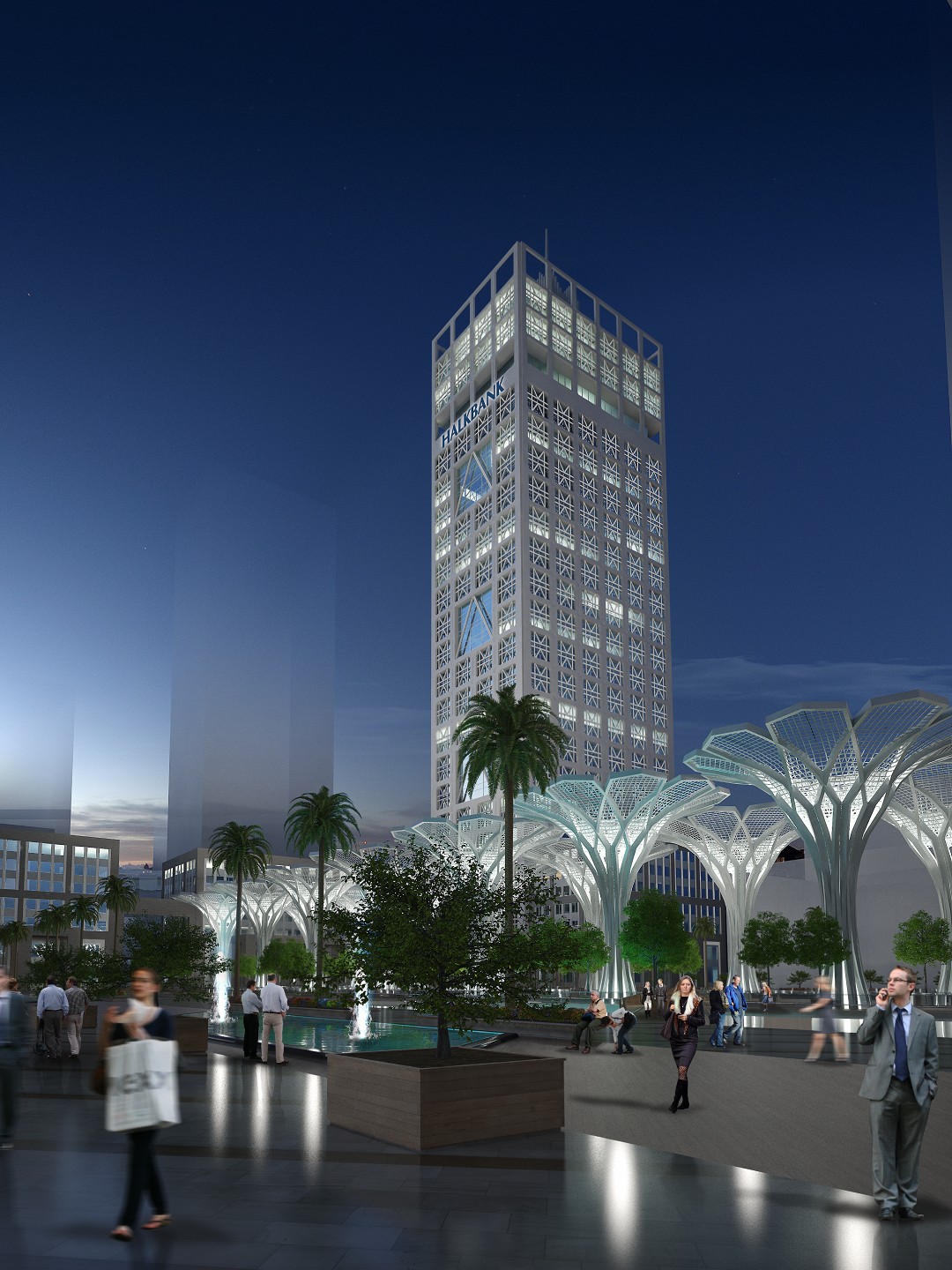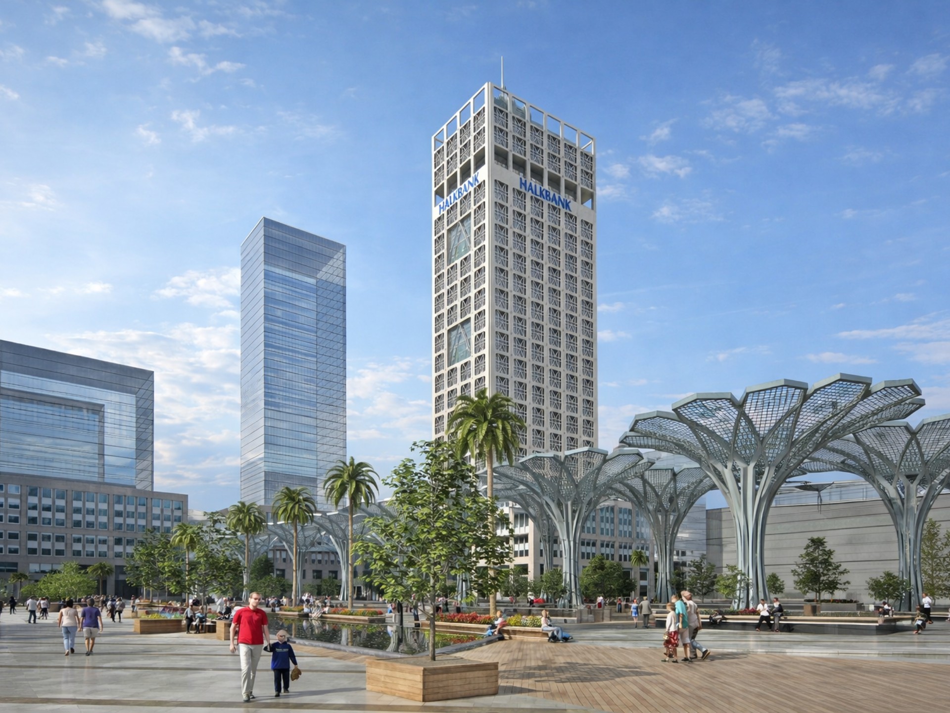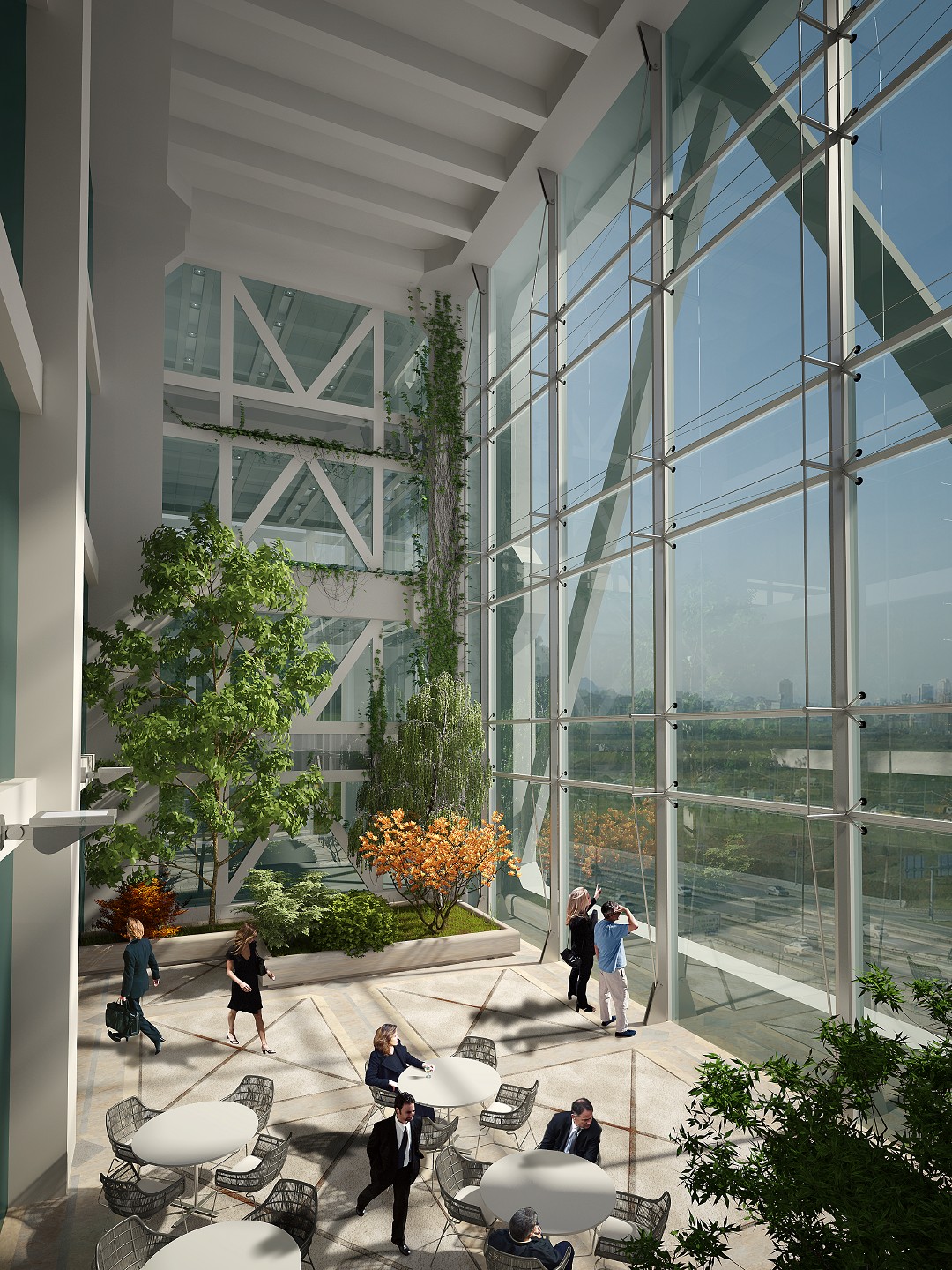 Sky gardens located within the tower masses and along the façades facing the inner courtyard provide employees with high-quality spaces enriched by natural light and a connection to greenery. The podium volumes engage with the public realm of the finance center, forming an urban environment defined at the human scale. Social floors and recessed glazed surfaces create a sense of lightness in the upper portions of the mass, while the crowning frame element elegantly completes the silhouette and conceals technical spaces, reinforcing the architectural integrity of the composition.