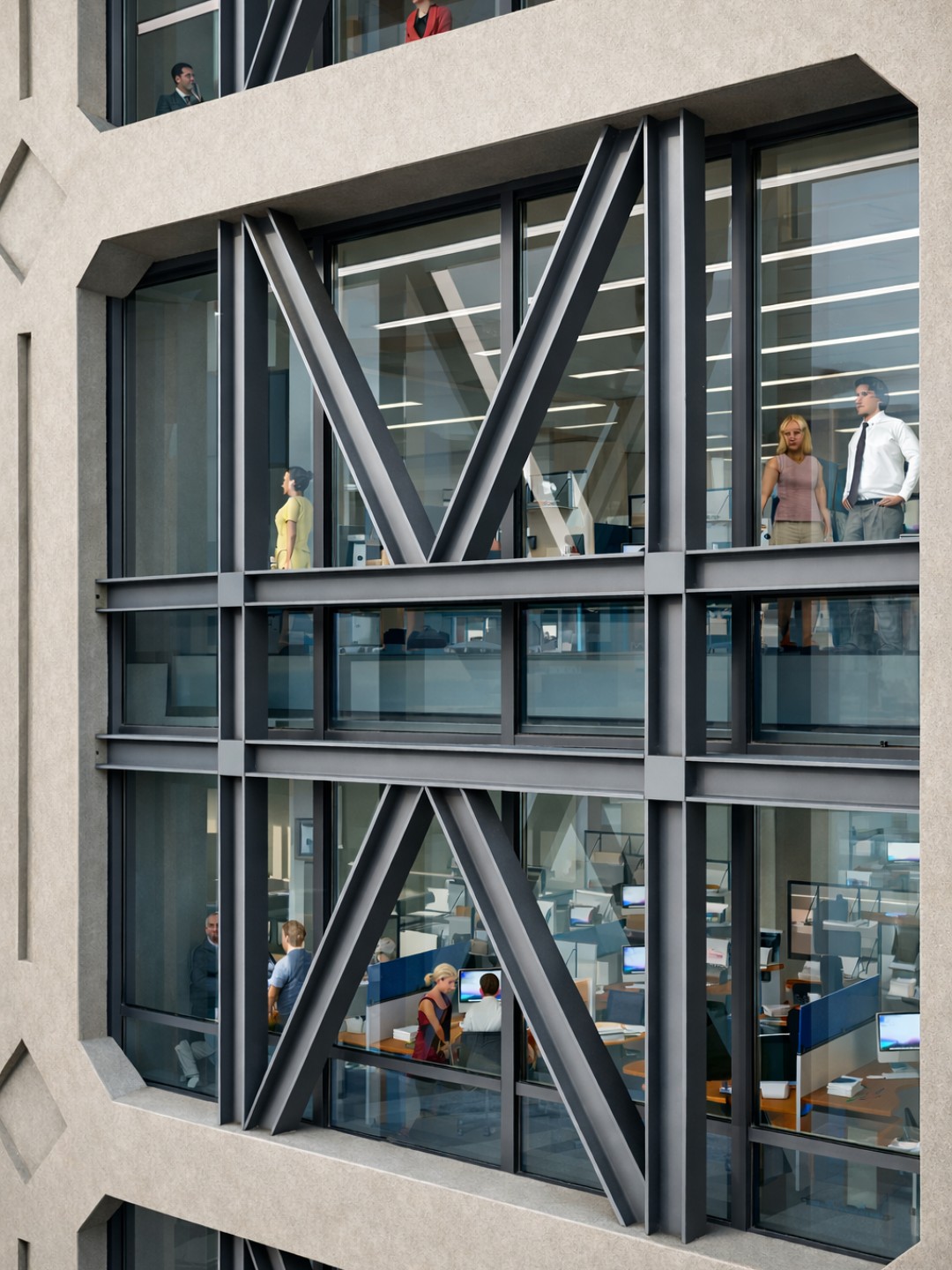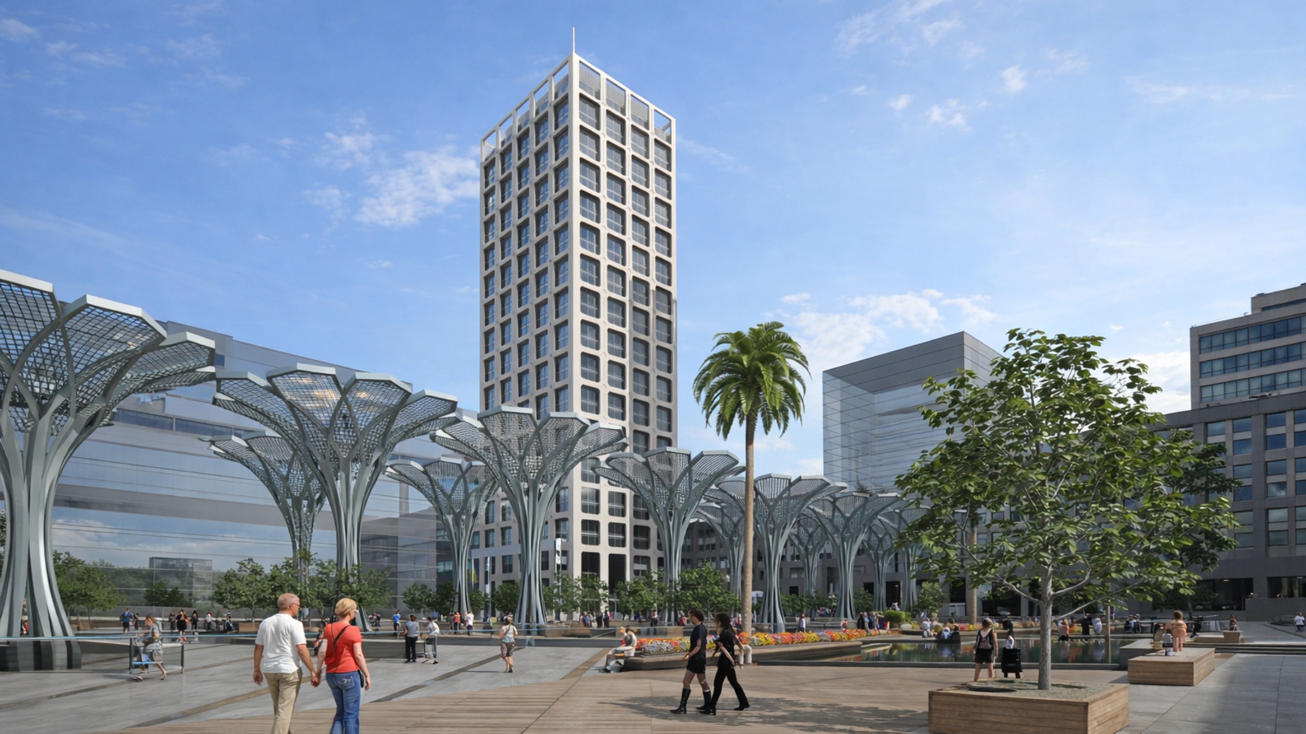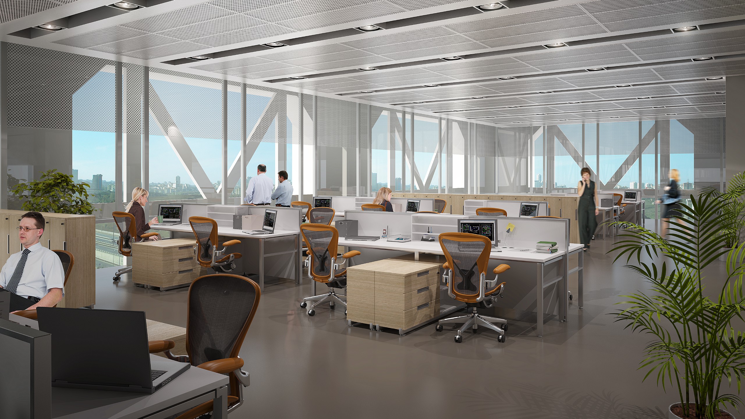 Sky gardens located within the tower masses and along the façades facing the inner courtyard provide employees with high-quality spaces enriched by natural light and a connection to greenery. The podium volumes engage with the public realm of the finance center, forming an urban environment defined at the human scale. Social floors and recessed glazed surfaces create a sense of lightness in the upper portions of the mass, while the crowning frame element elegantly completes the silhouette and conceals technical spaces, reinforcing the architectural integrity of the composition.