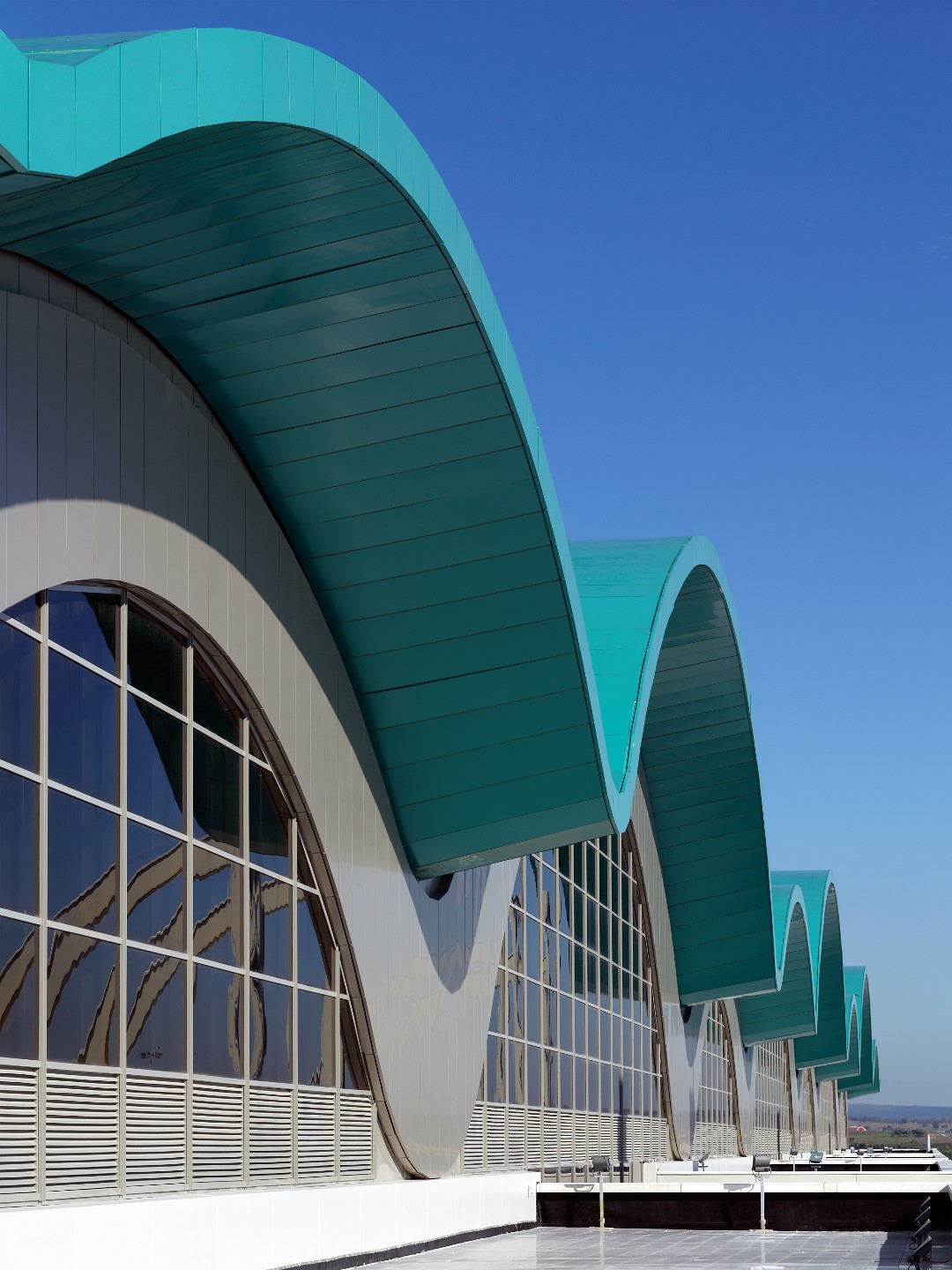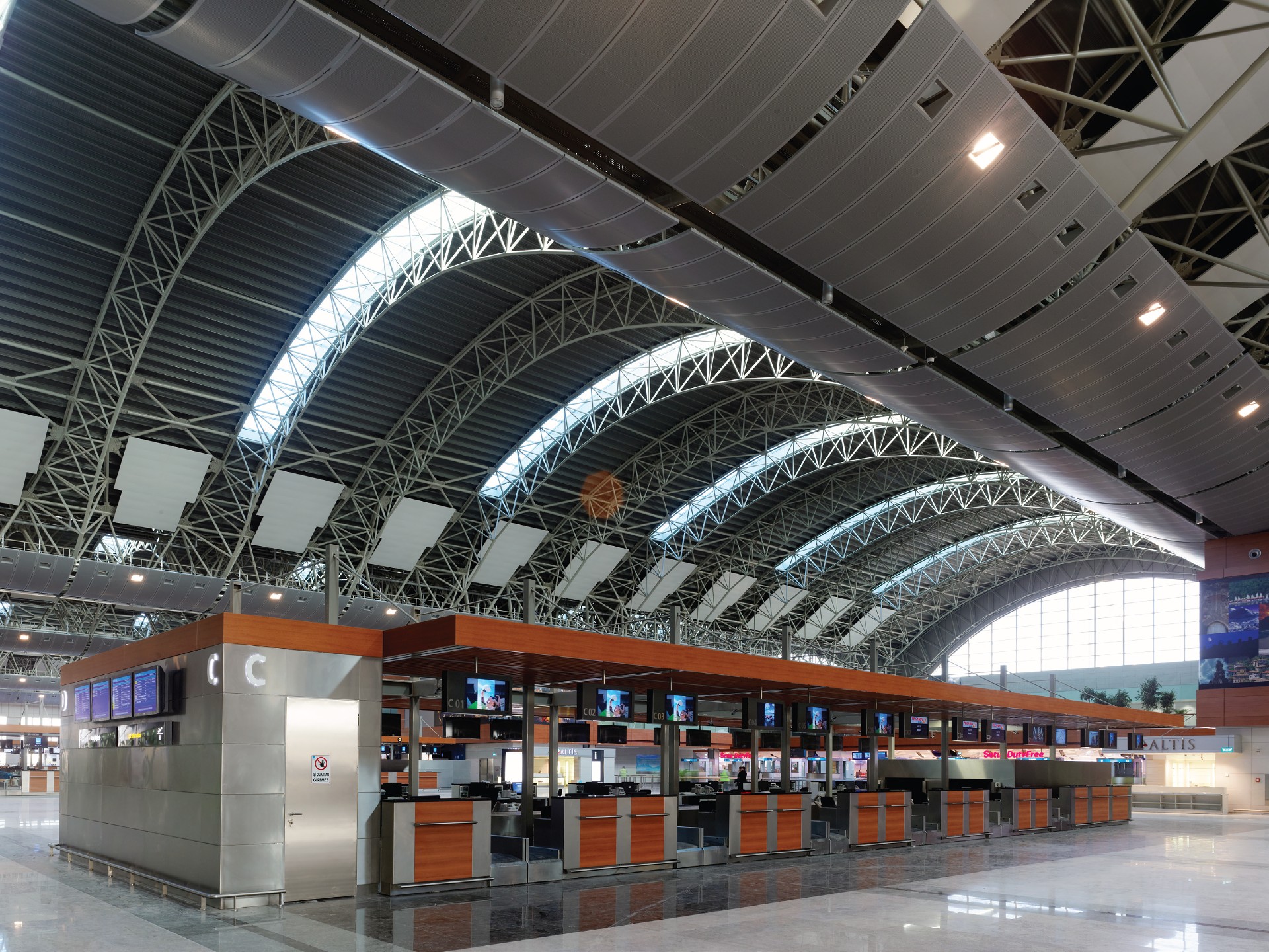The design balances international terminal standards with a spatial identity rooted in Istanbul. The wave-form steel roof spanning large bays defines the architectural character while introducing daylight into the main hall, creating a clear and spacious passenger environment.