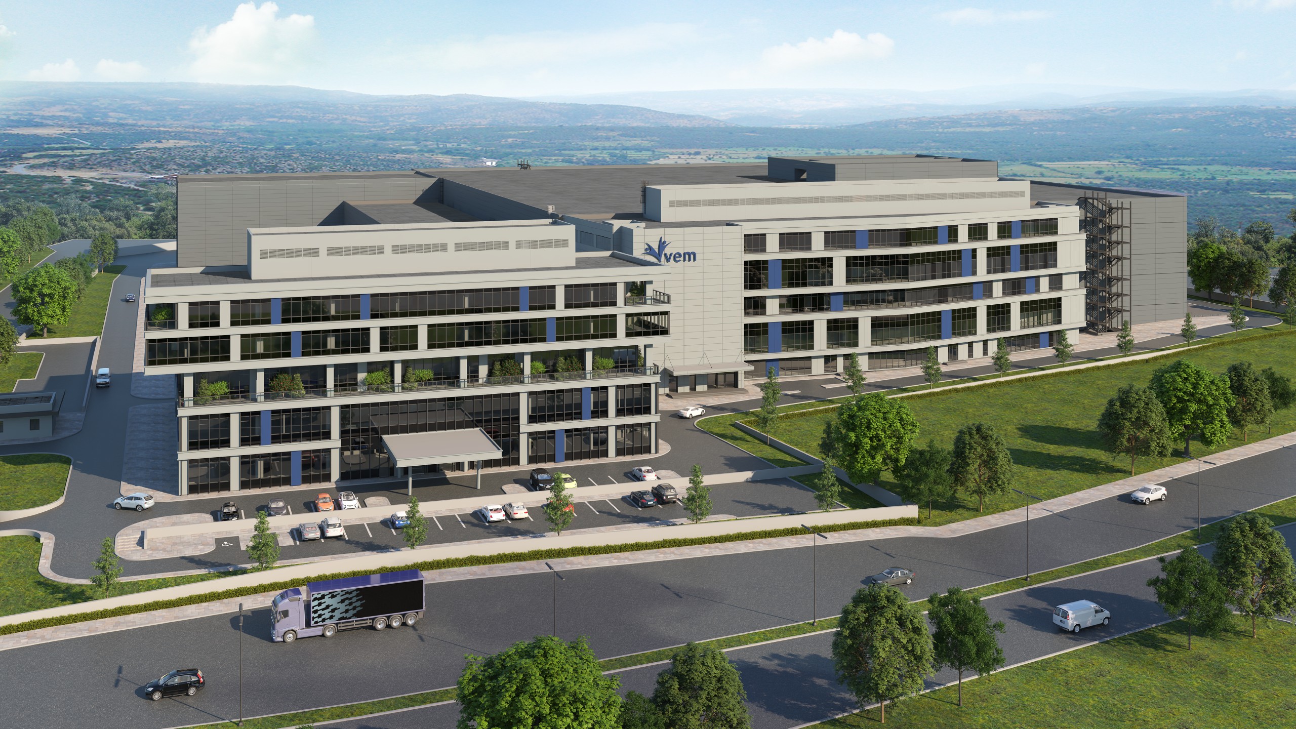 Vehicle circulation was a primary design driver; administrative and personnel traffic is strictly separated from heavy truck routes, ensuring that logistics do not pass in front of the administrative and R&D blocks. Furthermore, the pedestrian paths, perimeter walls, and lighting elements in front of these blocks utilize distinct materials and detailing to enhance the project’s representative character.